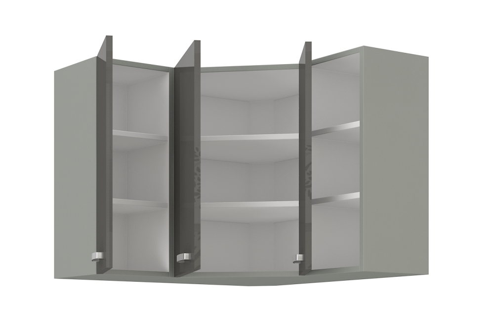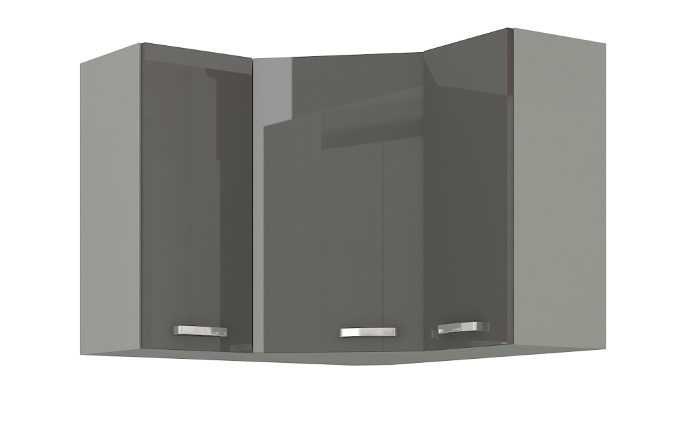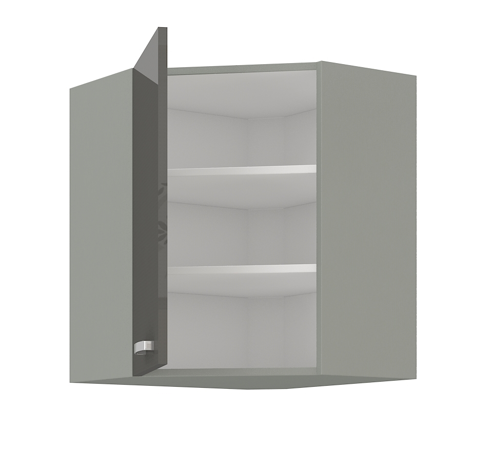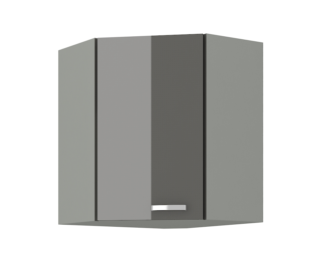 GREY rohová skrinka 60x60 GN-72 1F (45°) je 1-dverová skrinka. Je to horná, rohová skrinka. Umožní Vám tak využiť aj ťažko využiteľný priestor v rohu kuchyne. Skrinka je súčasťou modernej kuchynskej linky GREY. Skrinka disponuje systémom tichého uzatvárania dvierok. Vnútro skrinky tvoria 2 police.