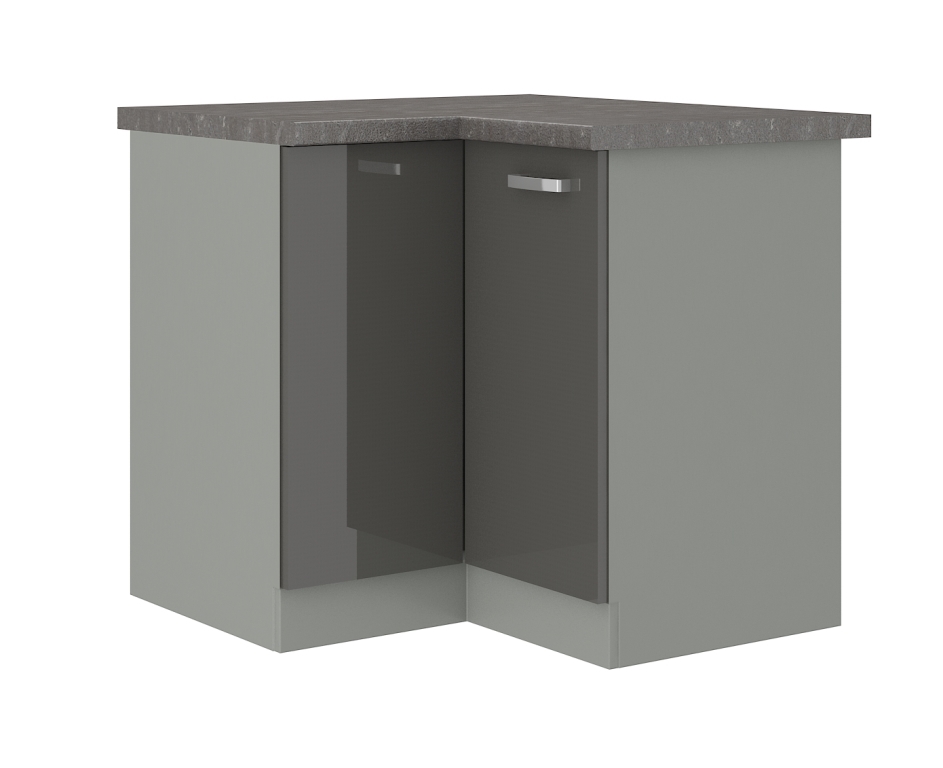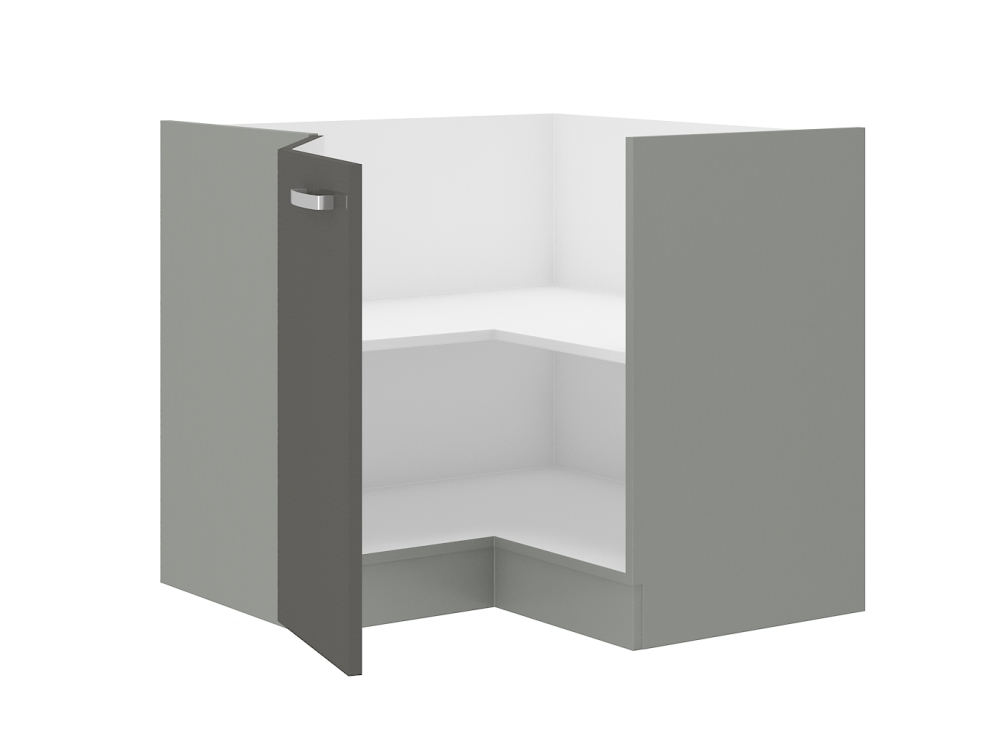 GREY rohová skrinka 90x90 ND 2F BB je 2-dverová skrinka. Je to dolná, rohová skrinka. Umožní Vám tak využiť aj ťažko využiteľný priestor v rohu kuchyne. Je súčasťou modernej kuchynskej linky GREY. Vnútro skrinky tvorí 1 polica.
