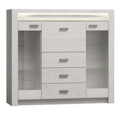 2-dverová vitrína INDIANAPOLIS I-08 s barom a 3 zásuvkami je súčasťou sektorového nábytku INDIANAPOLIS vysokej kvality v masívnom dizajne s prvkami surového maľovaného dreva a výraznou reliéfovou kresbou. Vitrína s ostatnými prvkam nábytku je vhodná na zariadenie obývacích izieb, spální, študentských izieb, kancelárií a jedálni. Je dostupná v troch farebných prevedeniach.