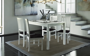Jedálenský set Max Max 5 + Milano 4 je moderný jedálenský set. Súčasťou setu je rozkladací jedálenský stôl a 4 jedálenské stoličiky. Vyrába sa v prevedení dreva biela v kombinácii s plátom stola v grafitovej farbe. Poťahovú látku na čalúnenie sedáka si vyberte sami.