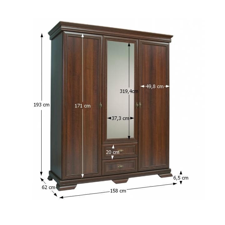 KORA KS2 je kvalitná priestranná 3-dverová skriňa inšpirovaná klasickým štýlom. Vnútorný priestor skrine je rozdelený na dve vešiakové časti a jednu policovú časť. O úložný priestor sa postarajú 1 vešiaková tyč v každej vešiakovej časti a 2 police vo vrchnej policovej časti a 2 zásuvky.