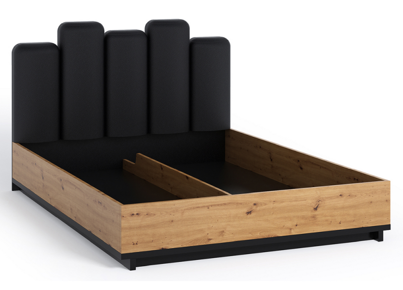 Jedinečná manželská posteľ s dreveným korpusom vo farbe dub artisan a krásnym netradične tvarovaným čalúneným čelom v čiernej látke. Posteľ je dodávaná s kovovým roštom na vzduchových pružinách, ktorý Vám umožní prístup k úložnému priestoru. Posteľ sa stane určite neprehliadnuteľným kúskom vo Vašej spálni. Súčasťou postele nie je matrac, čo Vám umožní uložiť si vlastný matrac alebo si objednať akýkoľvek z našej ponuky.
