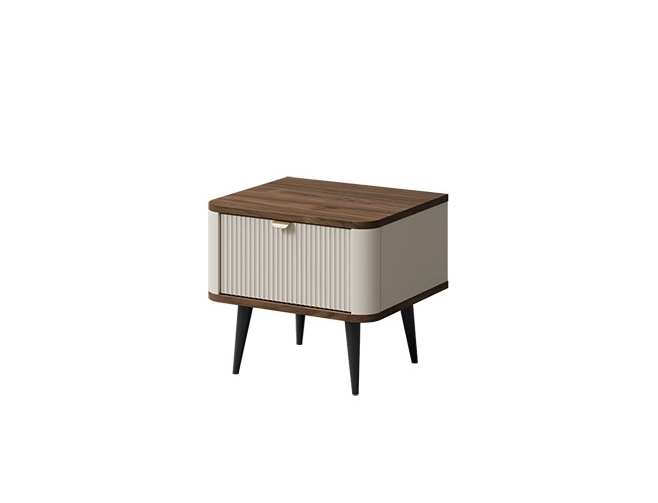 Nočný stolík MARLY je malý, no dizajnovo premyslený kus nábytku, ktorý skvelo doplní vašu spálňu alebo aj obývačku ako príručný stolík. Vyniká svojím elegantným vzhľadom v kombinácii matného kašmírového korpusu a vrchnej dosky v dekore šedého kameňa alebo orecha. Tento kontrast pôsobí moderne a zároveň nadčasovo.