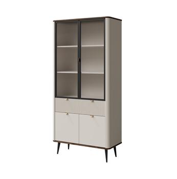 Estetiku tohto kúsku zvýrazňuje kontrastná vrchná doska v dekóre šedého kameňa alebo orecha, ktorá krásne ladí s telom v matnom béžovom prevedení. Výrazným detailom je rebrovaný povrch na strednej zásuvke, ktorý dodáva nábytku charakteristický a originálny vzhľad. Kovové nožičky zvyšujú celkovú stabilitu a zároveň uľahčujú upratovanie pod nábytkom. Regál MARLY je dostupný v dvoch farebných variantoch – s čiernymi alebo zlatými úchytkami, čo vám umožňuje ľahko zladiť ho so zvyškom interiéru. Tento kúsok je ideálny do obývačky, spálne, ale aj pracovne či predsiene – všade tam, kde oceníte štýlové a funkčné riešenie.