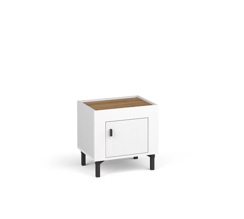 Nočný stolík z kolekcie MO11 je štýlový a funkčný doplnok každej spálne. Vďaka kompaktným rozmerom sa zmestí aj do menších priestorov, pričom ponúka praktický úložný priestor v podobe skrinky s dvierkami. Horná časť s dreveným dekórom poslúži na odloženie nočnej lampy, knihy či pohára vody. Charakteristické ryhovanie na čelách dvierok a decentné kovové úchyty dodávajú stolíku moderný a elegantný vzhľad. Kovové nožičky zabezpečujú stabilitu a zároveň uľahčujú upratovanie pod nábytkom.