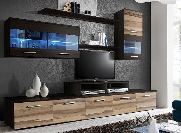- 2 RTV skrinky (1 RTV skrinka s 2 výklopnými dvierkami, 1 RTV skrinka s 3 výklopnými dvierkami a policovou nadstavbou)