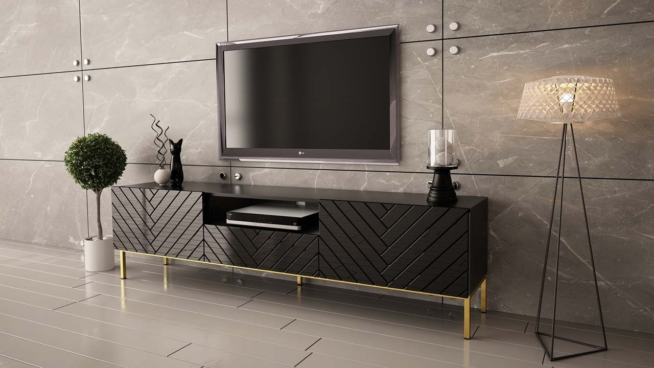 Krásna, luxusne pôsobiaca RTV skrinka v modernom a zároveň jemnom dizajne. RTV skrinka je na kovových nožičkách v zlatej farbe. Drevená časť je v bielom alebo čiernom lesku. Dominantou tejto skrinky sú frézované dvierka. Úložný priestor sa nachádza za 2 výklopnými dvierkami. V strednej časti je zásuvka a otvorená polička.