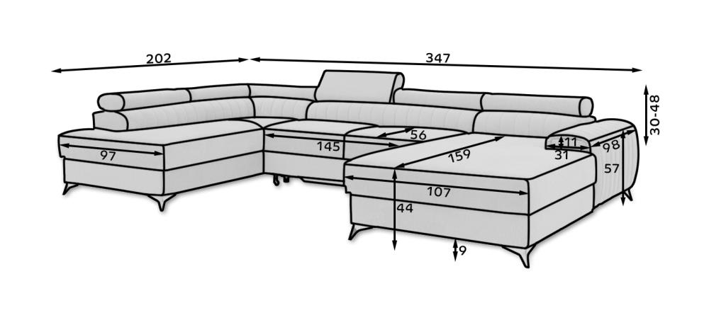 - šírka / hĺbka / výška (cm): 347/202x202/69-89