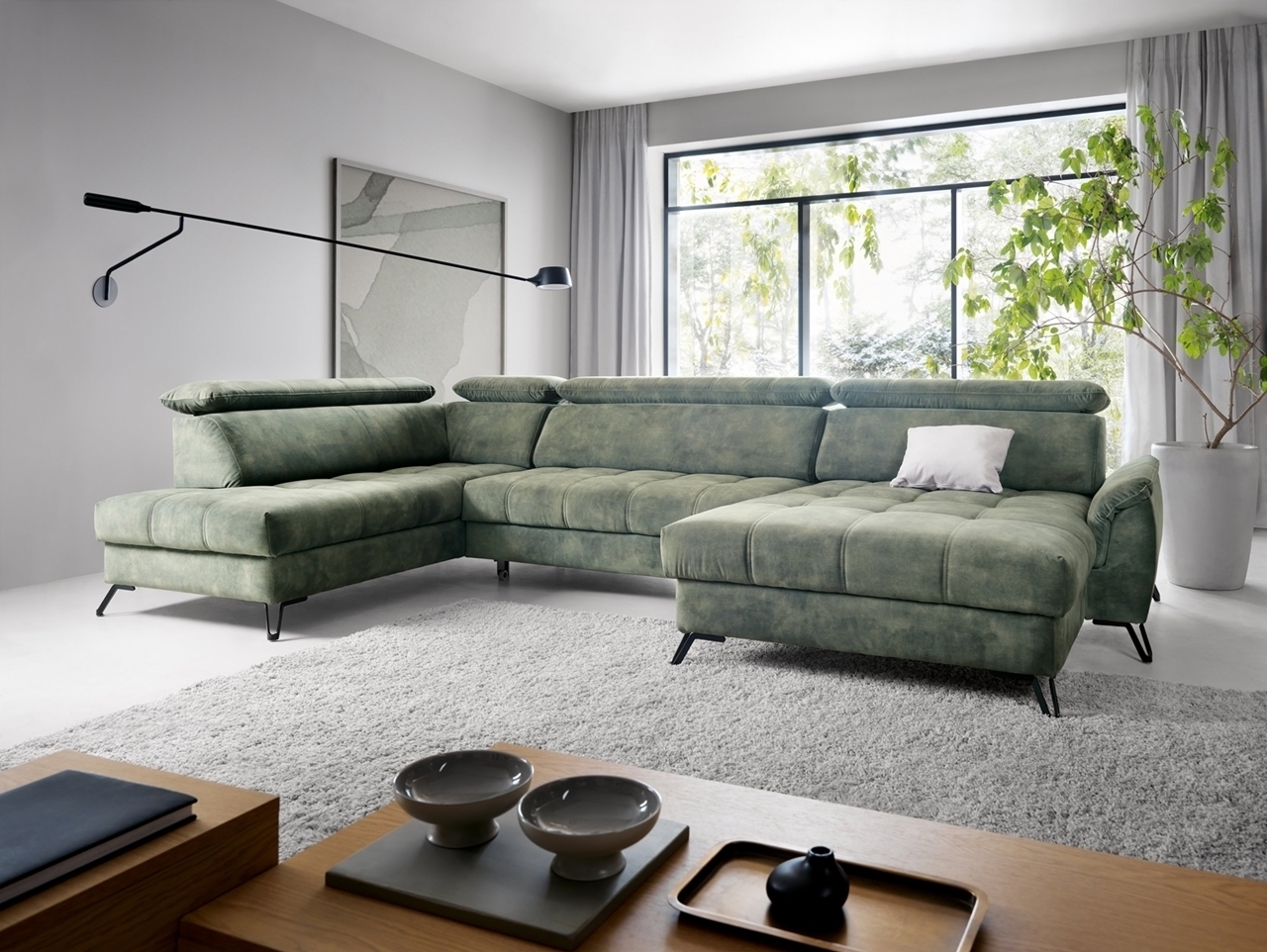 Táto moderná sedacia súprava v tvare U kombinuje elegantný dizajn s maximálnym komfortom a praktickými funkciami. Mäkké čalúnenie a kvalitné materiály zaručujú príjemný pocit na dotyk a dlhú životnosť. Štýlové kovové nohy dodávajú súprave ľahkosť a moderný vzhľad, vďaka čomu sa perfektne hodí do súčasných interiérov. Je ideálnym riešením pre tých, ktorí hľadajú spojenie dizajnu, funkčnosti a pohodlia.