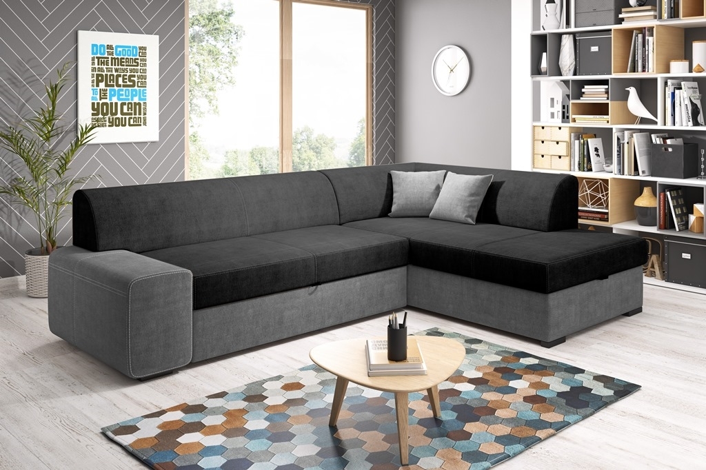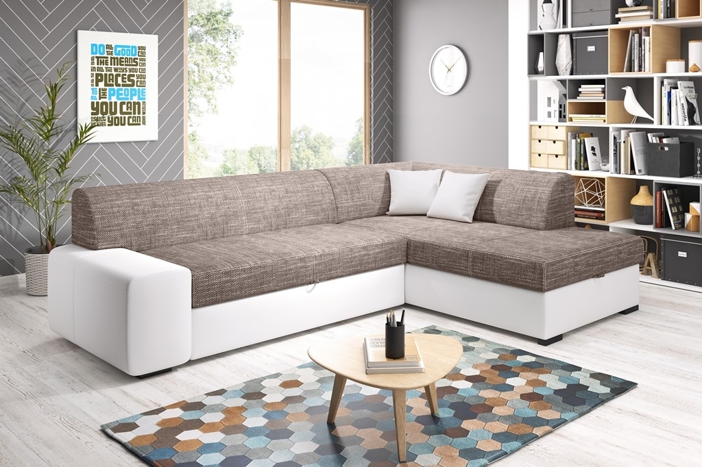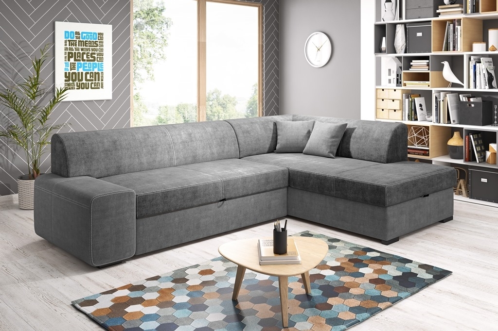 Rohová rozkladacia sedacia súprava MINOS v modernom dizajne s úložným priestorom na nožičkách. Sedacia súprava má jednoduchý, ale nadčasový dizajn. V ponuke je široké množstvo poťahových látok a ekokoží, vďaka ktorým si môžete vytvoriť sedaciu súpravu podľa Vašich predstáv. Súčasťou sedacej súpravy sú aj 2 malé dekoratívne vankúšiky.