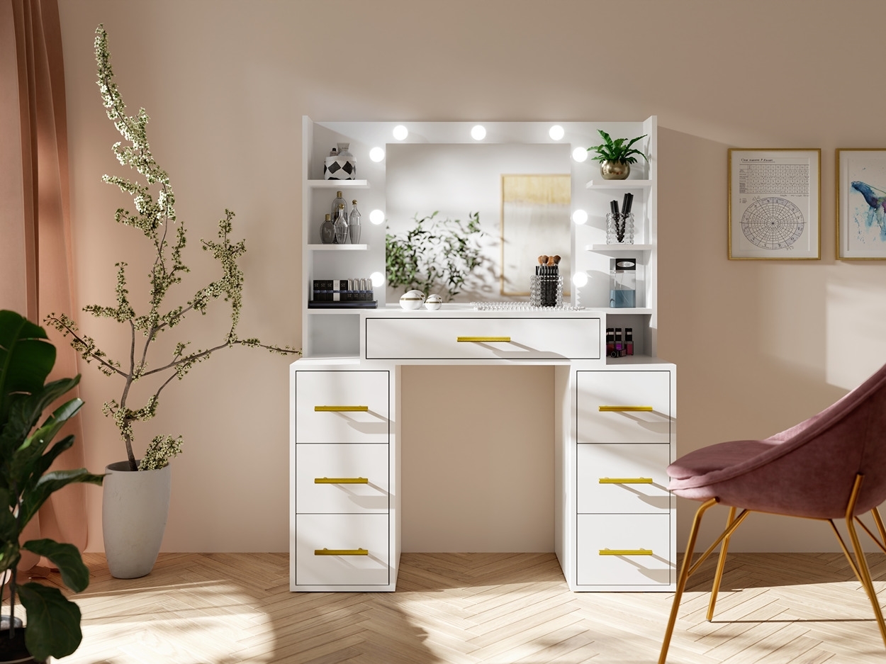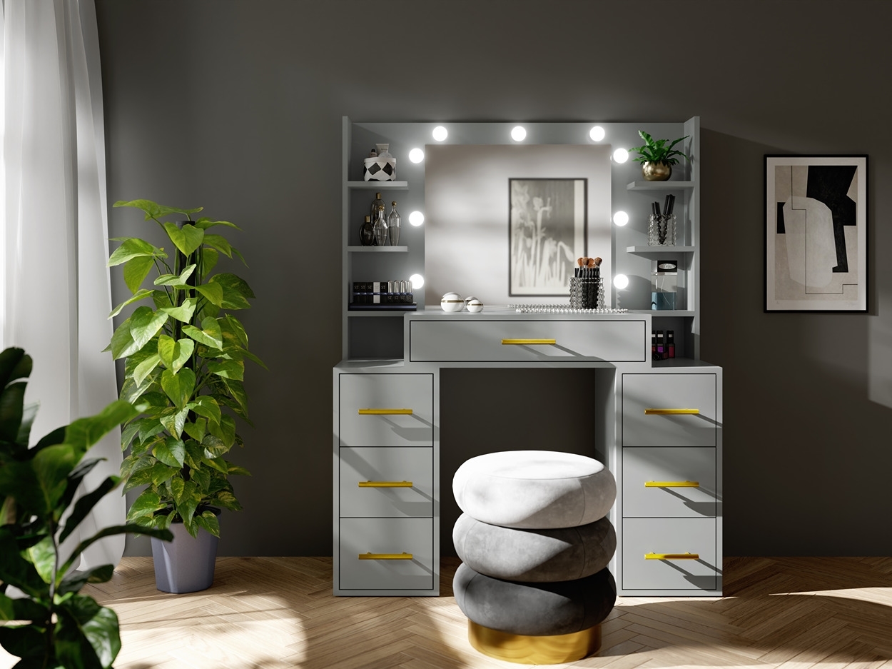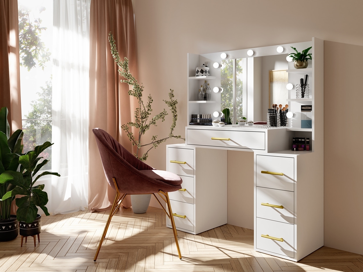 Toaletný stolík BROADWAYso zrkadlom a LED osvetlením najviac očarí ženské pohlavie. Súčasťou stolíka sú šuflíky, otvorené poličky a led osvetlenie pre lepšie svetlo pri skrašľovaní. Tento elegantný toaletný stolík je dokonalým doplnkom do modernej spálne alebo šatne či študentskej izby. Jeho dizajn  prináša do interiéru luxusný a sofistikovaný vzhľad. Stolík obsahuje praktickú širokú zásuvku doplnenú o ďalšie menšie zásuvky ktoré poskytnú dostatok úložného priestoru na kozmetiku, šperky a ďalšie doplnky. Zrkadlo s rovnakým dizajnovým rámom dodáva stolíku harmonický vzhľad a zároveň umožňuje pohodlné líčenie či úpravu vlasov. Tento toaletný stolík je ideálnou voľbou pre každého, kto hľadá funkčný, no zároveň štýlový kúsok nábytku, ktorý dodá priestoru nádych luxusu a praktickosti.