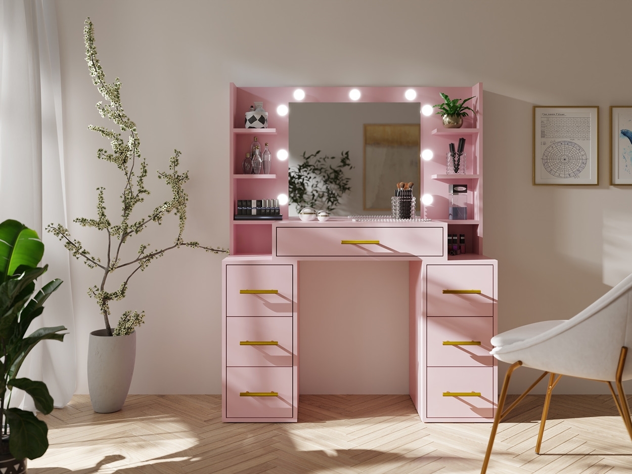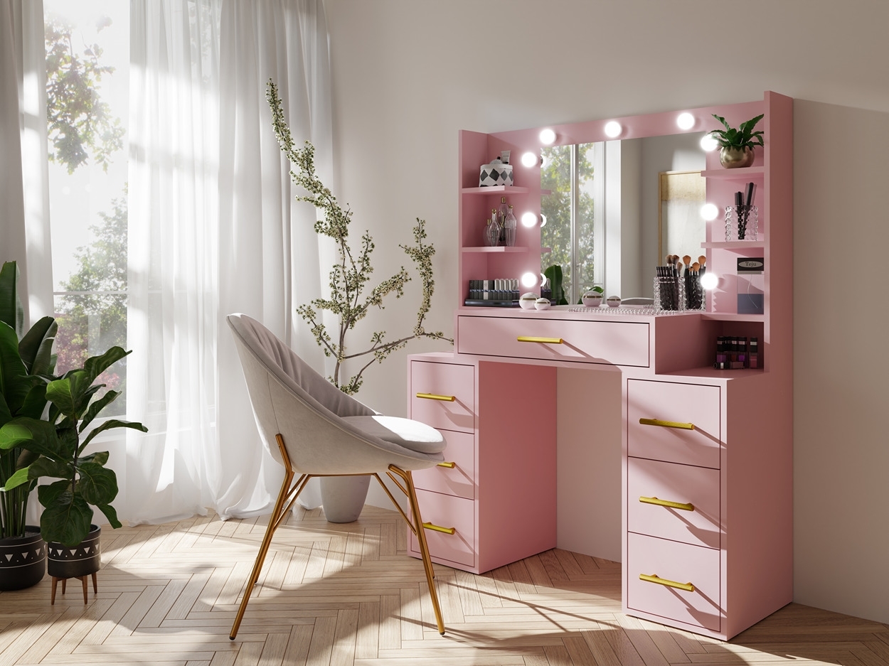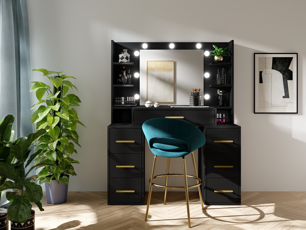 Toaletný stolík BROADWAYso zrkadlom a LED osvetlením najviac očarí ženské pohlavie. Súčasťou stolíka sú šuflíky, otvorené poličky a led osvetlenie pre lepšie svetlo pri skrašľovaní. Tento elegantný toaletný stolík je dokonalým doplnkom do modernej spálne alebo šatne či študentskej izby. Jeho dizajn  prináša do interiéru luxusný a sofistikovaný vzhľad. Stolík obsahuje praktickú širokú zásuvku doplnenú o ďalšie menšie zásuvky ktoré poskytnú dostatok úložného priestoru na kozmetiku, šperky a ďalšie doplnky. Zrkadlo s rovnakým dizajnovým rámom dodáva stolíku harmonický vzhľad a zároveň umožňuje pohodlné líčenie či úpravu vlasov. Tento toaletný stolík je ideálnou voľbou pre každého, kto hľadá funkčný, no zároveň štýlový kúsok nábytku, ktorý dodá priestoru nádych luxusu a praktickosti.