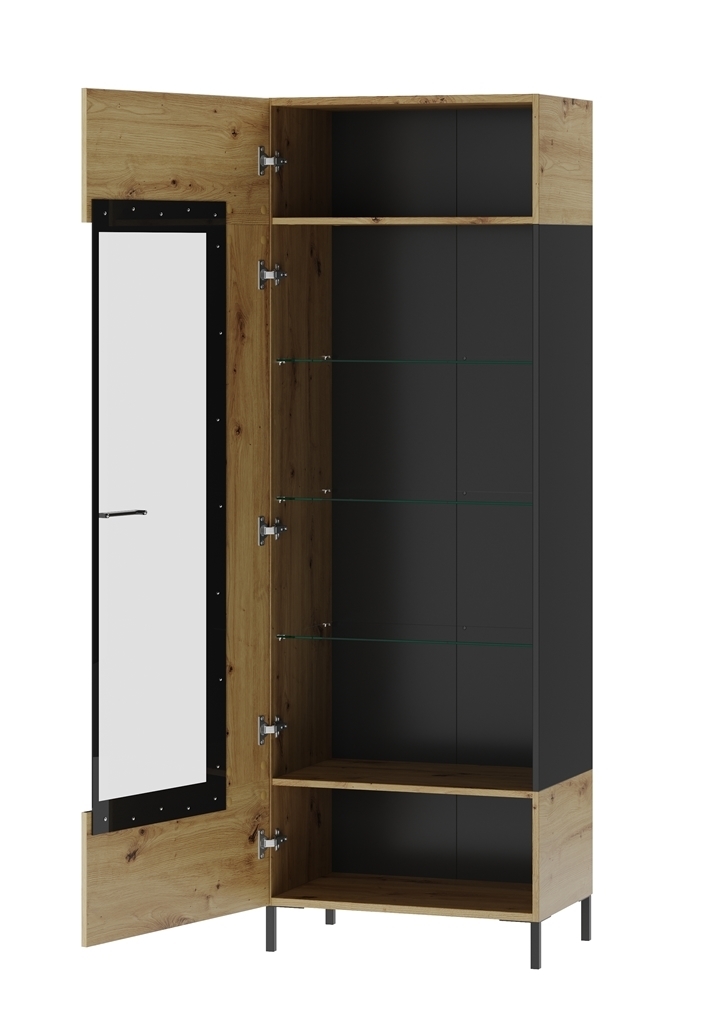 Táto moderná a kvalitná 1-dverová policová vitrína zo sektorového systému Lucas je vhodná do obývacích izieb. Vitrína Vám prinesie potešenie do Vášho domova vďaka množstvu úložného priestoru a dokonalej kombinácií dubu artisan a čierneho matu. Sektor LUCAS sa skladá z 12 samostatných prvkov, ktoré nájdete nižšie.