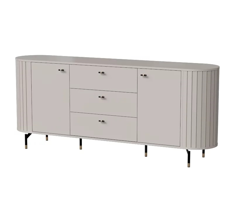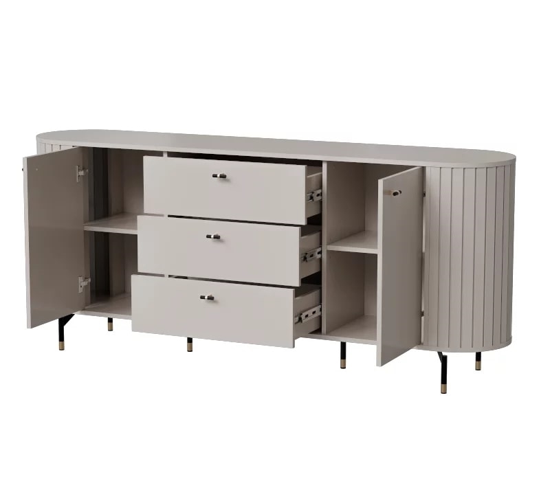 Komoda ZANTE ZA4 je harmonickým spojením elegancie, funkčnosti a štýlu. Charakteristický vertikálny frézovaný dekor, oblé bočné línie a štíhle kovové nohy s detailmi v zlatej farbe jej dodávajú sofistikovaný charakter a zároveň vytvárajú stabilný a vzdušný dojem. Vnútorný priestor je šikovne rozvrhnutý – dve skrinky s policami a tri zásuvky ponúkajú praktické riešenie na uskladnenie rôznych predmetov. Komoda ZANTE ZA4 výborne doplní moderné interiéry, pričom si zachová nadčasovosť, ktorá nepodlieha trendom.