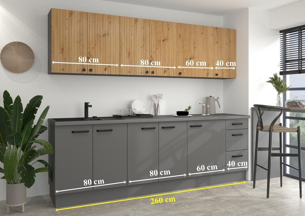 Kuchynská linka AVA + NESSA 260 vo farebnom prevedení antracit mat a dub artisan predstavuje dokonalú kombináciu prírodného vzhľadu a moderného dizajnu. Dub artisan prináša svetlý, teplý a útulný tón, ktorý dodáva kuchyni prirodzený šarm a svetlosť. Antracit v matnom prevedení zas vytvára elegantný kontrast so svojím hlbokým, tmavým odtieňom, ktorý celkovému vzhľadu dodáva sofistikovanosť a nadčasovosť. Spoločne tieto farby vytvárajú harmonický a vyvážený dizajn, ktorý sa hodí do moderných aj klasických interiérov. Ideálna voľba pre tých, ktorí hľadajú estetiku s prvkom luxusu a trvácnosti. Zaujímavosťou tejto kuchynskej linky sú dvierka s imitáciou lamiel, ktoré sa v dnešnom modernom dizajnte tešia veľkej obľube. Spodné skrinky sú na nožičkách s možnosťou regulácie výšky. K dispozícii je taktiež soklová lišta pre zakrytie nožičiek. Kuchynská linka disponuje systémom tichého uzatvárania dvierok a zásuviek.